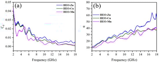 The relationship of (a) C0 and (b) α with frequency of HEO-Zn, HEO-Cu, and HEO-Mn.