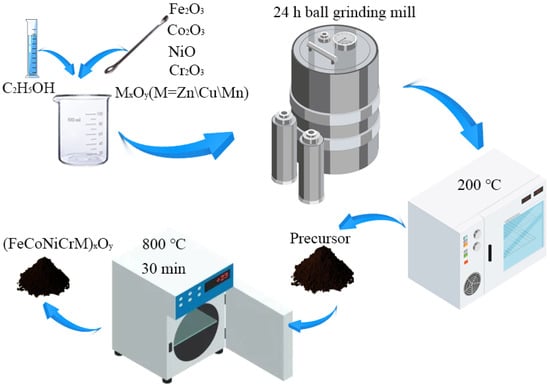 All the ferrites of (FeCoNiCrM)xOy (M = Zn, Cu, and Mn) were prepared by solid-state reaction. Taking (FeCoNiCrMn)xOy as an example, the synthesis process is described in detail as follows, which is also presented in the schematic drawing of Figure 12. Firstly, the oxides of 0.03 M Fe2O3, 0.06 M NiO, 0.02 M Co3O4, 0.03 M Cr2O3, and 0.06 M MnO were mixed with 50 mL anhydrous ethanol and then put into a mill pot. The ball-milling proceeded for 24 h in order to obtain the homogeneous oxide mixture. Subsequently, the mixture was dried in an oven and ground for 10 min to get black powders. Finally, the powders were heated to 800 °C in a furnace for 30 min, and afterward, the powders were taken out from the furnace and repeatedly ground for 10 min.