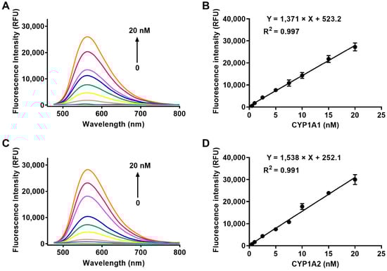 Fluorescence spectra of ERNM that incubated with increasing concentrations of CYP1A1 (A) and CYP1A2 (C). Fluorescence intensity of ERNM at 558 nm that incubated with various concentrations of CYP1A1 and CYP1A2. λex = 450 nm. Data in (B,D) are shown as the mean ± SD.
