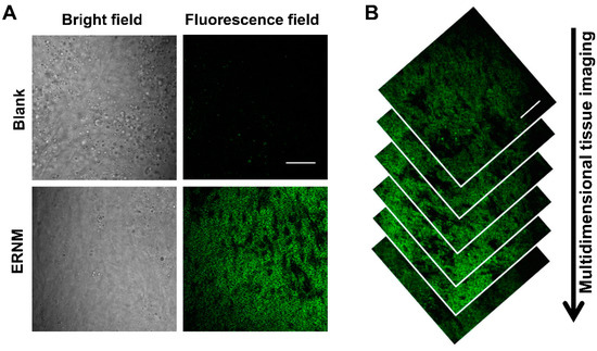 (A) Two-photon fluorescence images of the CYP1A in rat liver slices with ERNM. (B) Multidimensional two-photon fluorescence images of liver tissue treated with ERNM. Scale bar: 100 μm.
