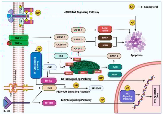 Anticancer role of kaempferol: at a molecular level, this compound is able to exert anti-cancer effects primarily by reducing the levels of proteins involved in the development and progression of cancer. This is accompanied by induction of apoptosis, arrest of the cell cycle, and downregulation of anti-inflammatory proteins. In addition, different molecular signaling pathways and mitochondrial mechanisms are involved in the activation of tumor cell apoptosis by kaempferol. The illustration is adopted with modifications from Amjad et al. []. Created with Biorender.com (accessed on 10 April 2023).