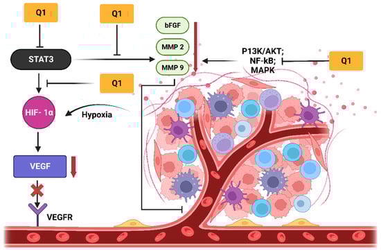 Anti-angiogenesis effects: quercetin (Q1) significantly inhibits the activation of VEGF by downregulating signaling molecules such as AKT and NF-kB, demonstrating the direct inhibition of VEGFR on the surface of endothelial cells. Additionally, the inhibition of the JAK- STAT3 pathway exerted anti-inflammatory and antitumor activities through the downregulation of MMP 2, MMP 9, TNF-α and bFGF. The inhibition of these factors retarded angiogenesis. VEGF and bFGF are two crucial factors in angiogenesis that upregulate the proliferation, migration, and formation of endothelial cells. The diagram was adopted with modifications from Asma et al. []. Created with Biorender.com (accessed on 10 April 2023).