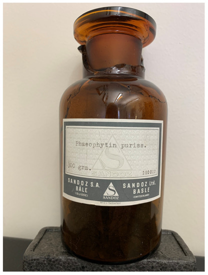 Gift bottle containing “Phaeophytin puriss. 300 grm.” (ca. 1961).