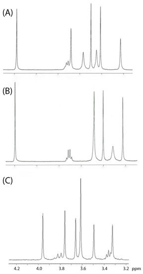 Proton NMR spectra (360 MHz, 3.2–4.2 ppm region, in CDCl3) of (A) 173-aspartylchlorin-e6 tetramethyl ester (19), (B) authentic NPe6 tetramethyl ester (152 regioisomer, (23)), and (C) 131-aspartylchlorin-e6 tetramethyl ester (22). The signals at ~4.2 ppm in (A,B) correspond to the methyl ester of the 131 substituent.