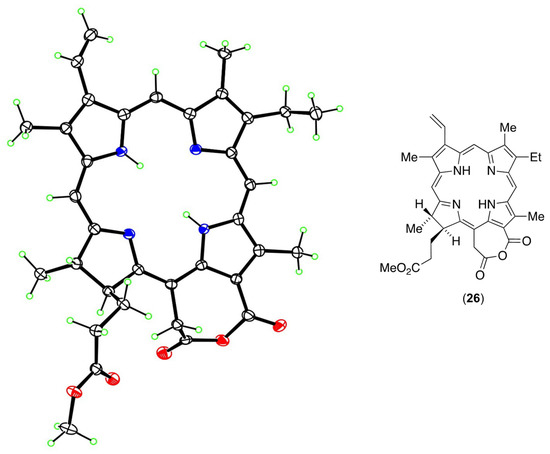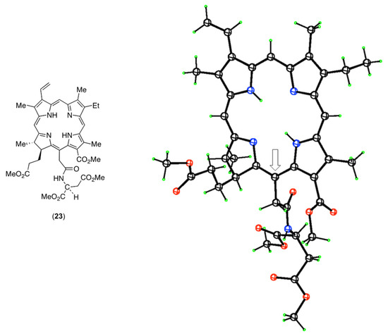 The most likely explanation for the formation of the 152-conjugate seemed to be that an anhydride (24) was formed between the chorin-e6 152 and 131 carboxylic acid groups [34]. This was more likely than a larger ring anhydride (25) between the 173 and 152 acids (Scheme 3). The aspartic acid nitrogen atom would then undergo nucleophilic attack upon the aliphatic side of the anhydride (24) to produce the 152 conjugate (15). To investigate this possibility, chlorin-e6 was treated with the DCC coupling reagent and DMAP, but in the absence of aspartic acid. The color of the solution turned from green to purple. We were not unaware of the fact that Hans Fischer [3] named certain anhydride derivatives of chlorophylls as “purpurins” because they are indeed purple in color! The purple material was isolated, treated with diazomethane, and crystallized to give the methyl ester (26). It was then investigated using single-crystal X-ray diffraction. The structure is shown in Figure 7, and the intermediacy of the anhydride in these conjugation reactions was firmly established [37].