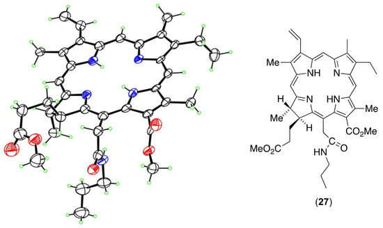 Reactions of (26) with a wide variety of nucleophiles (ethoxide, propylamine, isopropylamine, ethanolamine, p-tolylthiolate, phenoxide, isobutoxide, and benzyloxide) all yielded the 152-conjugates, with several of these structures (e.g., Figure 8) being confirmed by single-crystal X-ray structures [37]. In all these reactions, a clear color change from green (chlorin-e6) to purple (anhydride) upon addition of peptide coupling reagent and base, and then back to green (chlorin-e6) after the addition of nucleophile, was observed; reaction progress could simply by tracked using the naked eye.