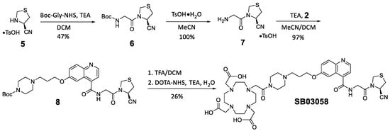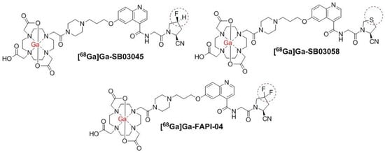 - Lindner, T.; Loktev, A.; Altmann, A.; Giesel, F.; Kratochwil, C.; Debus, J.; Jäger, D.; Mier, W.; Haberkorn, U. Development of Quinoline-Based Theranostic Ligands for the Targeting of Fibroblast Activation Protein. J. Nucl. Med. 2018, 59, 1415–1422. [Google Scholar] [CrossRef]