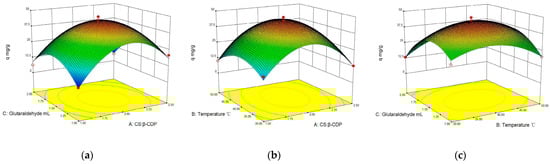 Effects of interaction of various factors on BSA adsorption: (a) glutaraldehyde addition and temperature; (b) glutaraldehyde addition and mass ratio of β-CDP and CS; and (c) mass of β-CDP and CS ratio and temperature.