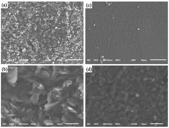 The SEM was utilized to examine the morphology of the CS/β-CDP composite membrane before and after BSA adsorption (Figure 3). The morphology of the prepared membranes is relatively rough (Figure 3a,b), with a large number of protrusions on them. This may be due to the exposure of hydroxyl and amino groups to the addition of glutaraldehyde, which induces their fusion with the protein. Although the distribution of pores in the CS/β-CDP composite membrane is not uniform, it still has a large specific surface area and adsorption space, which is similar to the previous report by Verma and colleagues []. The surface of the BSA-adsorbed CS/β-CDP composite membrane is smooth (Figure 3c,d). The sample had several cracks and visible pore structure, which shows that the cavity structure on the membrane’s surface is filled and that the BSA is physically adsorbing to the composite membrane.