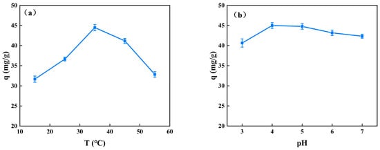 Effects of adsorption temperature and pH on the adsorption capacity of BSA: (a) adsorption temperature; (b) adsorption pH.
