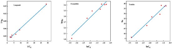 The adsorption isotherms for BSA removal using CS/β-CDP composite membrane and the adsorption key parameters are tabulated in Table 6. The nonlinear fitting of BSA on the composite membrane is shown in Figure 7, and the linear fitting is shown in Figure 8. The R2 values of the Langmuir isotherm model, Freundlich isotherm model, and Temkin isotherm model are 0.9932, 0.9453, and 0.9565, respectively. BSA adsorption increases with the increase of initial BSA concentration and reaches equilibrium at 1 mg/mL. Based on the R2 value, the Langmuir isotherm was selected to describe the adsorption of BSA on the CS/β-CDP composite membrane. This result may confirm the monolayer adsorption of BSA onto the CS/β-CDP composite membrane surface [,]. The adsorption sites are evenly distributed on the surface [,], which is in direct contact with CS/β-CDP composite membrane []. From the Freundlich isotherm, K and 1/n indicate adsorption capacity at unit concentration and adsorption intensity, respectively. The K value is obtained at about 76.5237, and the n value is obtained at about 1.4407, indicating that CS/β-CDP composite membrane had a strong adsorption capacity for BSA [,], and it is spontaneous [], which is similar to the previous report by Feng and colleagues []. When 0 < 1/n < 1, it indicates that the adsorption sites and strengths are non-uniformly distributed on the surface of the composite membrane []. The CS/β-CDP composite membrane has been found to exhibit multilayer adsorption of BSA on its outer surface [,]. The Temkin isotherm model assumes a linear relationship between the adsorption heat and the adsorption uptake of BSA []. The results of the Temkin model exhibit that there is a physical adsorption mechanism for BSA on the CS/β-CDP composite membrane, which is consistent with SEM results. Based on the R2 value, the order of the adsorption isothermal models of BSA on the CS/β-CDP composite membrane is as follows: Langmuir > Temkin > Freundlich.