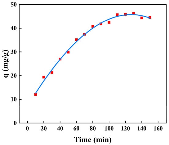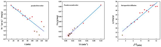 The adsorption kinetics for BSA removal using CS/β-CDP composite membrane and the adsorption key parameters are tabulated in Table 7. The nonlinear fitting of the kinetic adsorption of BSA on the composite membrane is shown in Figure 9, and the linear fitting is shown in Figure 10. The R2 values of pseudo-first-order, pseudo-second-order, and intraparticle diffusion are 0.7806, 0.9874, and 0.9301, respectively. The adsorption data follows the pseudo-second-order kinetic model with R2 values close to 1.0 for BSA adsorption, which is evident that the chemisorption has occurred on CS/β-CDP composite membrane [], which showed good agreement with FT-IR and XRD. BSA diffused from that surface to the internal adsorption site of the CS/β-CDP composite membrane and attaches to the membrane by covalent bonding with the active group on the membrane []. It can be seen from the intraparticle diffusion figure that the CS/β-CDP composite membrane had a high adsorption rate at the initial stage, which is a surface diffusion process. With the increase of time, the adsorption rate decreases, and intragranular diffusion occurs. However, the equation does not pass through the origin, indicates that intraparticle diffusion is not the only step for controlling the rate, indicating that BSA is not easily diffused inside that membrane [], which is similar to the previous report by Huang and colleagues []. BSA is membrane-adsorbed on the CS/β-CDP composite membrane due to BSA and the functional groups on the surface of the CS/β-CDP composite membrane are combined through covalent bonding, an electrostatic interaction, van der Waals forces, a hydrogen bond, and other interactions. The adsorption rate of BSA is affected by chemical factors [], such as the number and structure of functional groups on the membrane surface, BSA concentration, temperature, and the degree of the chemical reaction between BSA and the membrane []. Therefore, BSA adsorption kinetic could be controlled by a combination of intragranular diffusion and surface diffusion. Based on the R2 value, the order of the sequence of kinetics models of BSA on the CS/β-CDP composite membrane is as follows: pseudo-second-order > intraparticle diffusion > pseudo-first-order.
