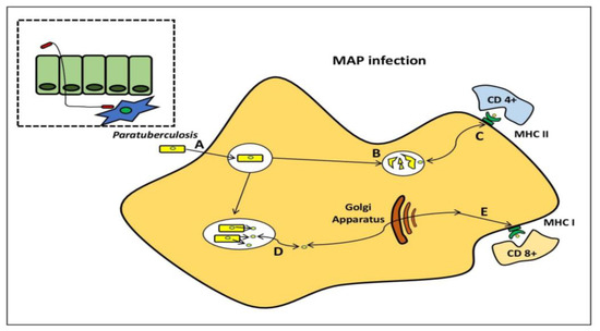 Mycobacterium avium subspecies paratuberculosis within the macrophage. MAP bacilli pass by the mucosal barrier, preferentially via M cells, and after which it is engulfed by sub-epithelial macrophage (A). MAP bacilli degrade within the phagosome (B) and also stimulateCD4+ immune responses via antigen presentation through the MHC class II pathway. (C) MAP evades destruction within phagosome through the inhibition of general killing mechanisms and proliferates. (D) MAP proteins are secreted from the phagosome to the cytosol and are subsequently available for presentation to (E) CD8+ immune responses via the MHC class I pathway.