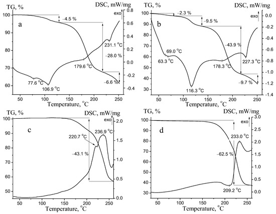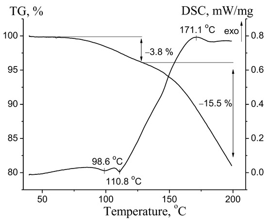 Only slightly shifted absorption bands of the reactant Na(hfac) were observed in the IR spectra of the mixture after grinding (Figure 2, Table 1). The IR data corresponded to the results of XRD analysis, and indicated that the reaction passed through a series of intermediate stages and led to the formation of only traces of the final product under the grinding conditions used. The conclusion about the multistage nature of the process under study is consistent with modern ideas about the dynamics of mechanochemical processes, according to which solid-state mechanochemical reactions proceed in several stages, including grinding and physical mixing of reagents, their homogenization at the molecular or cluster level, and the conversion of the activated reactants into reaction products [24]. Earlier, we showed that the transformation of the activated mixture into the final products for a number of mechanically stimulated solid-state reactions occurs when the mixture is heated [25]. In this regard, we carried out a thermoanalytical study of the reaction mixtures.
