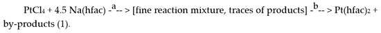 Comparison of the PtCl4–4.5Na(hfac) reaction to previously studied Na(hfac) reactions with PtCl2 or K2PtCl6 (Figure 3c,d) [12] demonstrated that the reaction with PtCl4 proceeded under much milder conditions (at a temperature ~50–60 °C or more lower than with PtCl2 or K2PtCl6) and results in the formation of Pt(hfac)2 with a higher conversion degree.