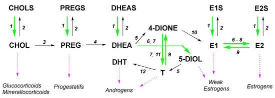 Crucial role of some enzymes involved in the synthesis of steroid hormones (steroidogenesis). CHOL—Cholesterol; CHOLS—Cholesterol sulfate; DHEA—Dehydroepiandrosterone; DHEAS—Dehydroepiandrosterone sulfate; 5-DIOL—Androst-5-ene-3β,17β-diol; 4-DIONE—Androst-4-ene-3,17-dione; E1—Estrone; E1S—Estrone sulfate; E2—Estradiol; E2S—Estradiol sulfate; PREG—Pregnenolone; PREGS—Pregnenolone sulfate; T—Testosterone. 1: Steroid sulfatase; 2: SULT—Sulfotransferase; 3: CYP11A1; 4: CYP17A1; 5: 3β-HSDs; 6: 17β-HSD1; 7: 17β-HSD5 or AKR1C3; 8: 17β-HSD12; 9: 17β-HSD2; 10: Aromatase; 11: 17β-HSD3; 12: 5α-Reductase.