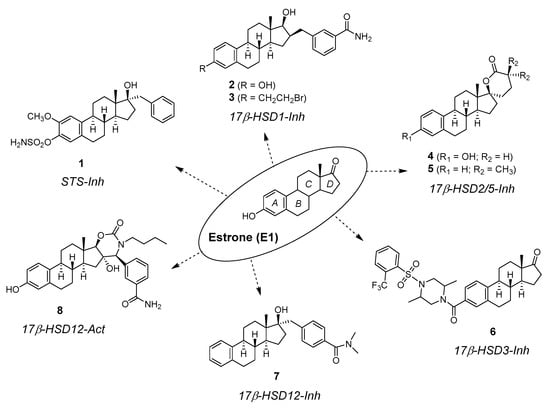 From the C18-steroid estrone (E1) as a starting material and using a short sequence of reactions, the introduction of a functionalized side chain at key positions, such as positions C-3, C-16, C-17, or both C-16 and C-17, made it possible to generate seven inhibitors (compounds 1–7) and one activator (compound 8) of steroidogenic enzymes [STS, 17β-HSDs 1, 2, 3, and 12, and AKR1C3 (17β-HSD5)], all involved in the biosynthesis of estrogens and androgens. Irreversible STS inhibitor 1 combines three important elements, namely, a hydrophobic group at C-17α, a sulfamate group at C-3, and a methoxy group at C-2 of estradiol (E2), resulting in a very potent and non-estrogenic inhibitor. The 17β-HSD1 inhibitors were obtained by adding an m-carbamoylbenzyl chain at C-16β of E2, while a judicious modification of the C-3 position (from OH to BrCH2CH2) made it possible to obtain inhibitor 2 (reversible) and inhibitor 3 (irreversible), the latter of which proved effective when tested in cancer and endometriosis animal models. 17β-HSD2 and 17β-HSD5 (AKR1C3) inhibitors share the common element of a spiro-δ-lactone ring at C-17 of E2, but the addition of two methyl groups at C-3′ and the absence of the OH at C-3 make inhibitor 5 selective for 17β-HSD5, unlike inhibitor 4. The introduction at position C-3 of E1 of an arylsulfonamidodimethylpiperazine chain optimized during SAR studies led to 17β-HSD3 inhibitor 6. For 17β-HSD12, a first family of inhibitors represented by compound 7 was obtained by adding a p-amido-benzyl chain in position C-17α of desoxy-E2, while diversification of the positions C-16 and C-17 made it possible to obtain compound 8, a first activator of an enzyme involved in steroidogenesis.