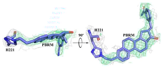 Inhibitors 2 and 3: 17β-Hydroxysteroid dehydrogenase type 1 (17β-HSD1) is a cytosolic enzyme involved in the last step of the biosynthesis of E2, the most potent estrogen, from E1 [,,]. Using DHEA as substrate, this enzyme is also involved in the formation of 5-diol, a weak estrogen that becomes more important at menopause, when the ovaries no longer produce E2. Inhibitor 2 (CC-156) effectively blocks the conversion of E1 to E2 by purified human 17β-HSD1 (Ki = 0.9 nM), as well as by the 17β-HSD1 activity present in human T47D cancer cells (IC50 = 27–44 nM) [], and this by competing with E1 in the catalytic site, as shown by the 3D analysis of the 17β-HSD1/CC-156 complex [] (Table 3). Despite its ability to reverse the proliferation of ER+ T47D cells induced by E1, inhibitor 2 also exerts an estrogenic effect when tested alone in this cell model, as well as in mice []. Since this residual estrogenic activity of reversible competitive inhibitor 2 is not compatible with its intended therapeutic use, a structure-activity relationship (SAR) study subsequently made it possible to identify inhibitor 3 (PBRM) []. Here, the replacement of the 3-OH of 2 (CC-156) by a short 2-bromoethyl chain made it possible to obtain the irreversible competitive inhibitor 3, as shown beyond all doubt by the 3D analysis of the 17β-HSD1/PBRM complex (Figure 3) []. Indeed, we observed the formation of a covalent bond between a nitrogen atom of histidine-221 of human 17β-HSD1 and the methylene group (CH2) of the short side chain (displacement of Br). It is, therefore, an irreversible inhibitor (Ki = 368 nM and Kinact = 0.087 min−1) when tested in pure human enzyme but selective for 17β-HSD1 (mild alkylating agent) []. Inhibitor 3 is less potent than inhibitor 2 in T47D cells (IC50 = 68 and 27 nM, respectively), but unlike its reversible analog 2, it did not show estrogenic activity in mice []. Thanks to these characteristics, inhibitor 3 was able to effectively block the growth of tumors (xenografts of T47D human cancer cells in nude mice) induced by two precursors of E2, namely E1 and DHEA [], and has also shown its efficacy in a monkey model of endometriosis [].