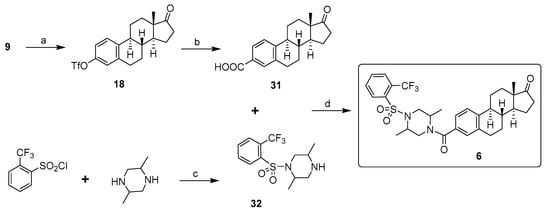 Inhibitor 6: 17β-HSD3 inhibitor 6 was synthesized in three steps, as reported in Scheme 6. E1 (9) was first transformed into E1-triflate (18) with trifluoromethanesulfonic anhydride and pyridine. The carboxylic derivative 31 was generated by palladium-catalyzed hydrocarbonylation of aryl triflate 18 with Pd(OAc)2, KOAc, 1,1′-bis(diphenylphosphino)ferrocene (dppf) in DMSO under an atmosphere of carbon monoxide, as reported by Cacchi and Lupi []. On the other hand, amine 32 was obtained in one step by reacting 2-(trifluoromethyl)benzenesulfonyl chloride with an excess of trans-2,5-dimethylpiperazine. Finally, the formation of an amide bond between the carboxylic acid 31 and the amine 32 using hexafluorophosphate benzotriazole tetramethyl uronium (HBTU) as a coupling agent provided 17β-HSD3 inhibitor 6 [].