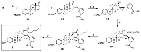 Synthesis of 17β-HSD12 activator 8 from estrone (9). Reagents and conditions: (a) methoxymethylchloride, DIPEA, CH2Cl2, RT (85%); (b) 3-CN-benzaldehyde, KOH, EtOH, 100 °C (79%); (c) NaBH4, MeOH, RT (98%); (d) m-CPBA, CH2Cl2, RT (22%); (e) butylamine, EtOH, microwave, 180 °C (37%); (f) triphosgene, DIPEA, DCM, RT (80%); (g) 10% HCl in MeOH, 50 °C (70%).