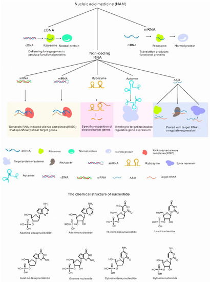Classification of NADs. NADs include cDNA (translation function protein) [16], mRNA (translation function protein) [17] and noncoding RNAs [18]. Noncoding RNAs include ASO (antisense oligonucleic acid, binding target genes to regulate gene expression) [19], ribozymes (specific splicing RNA) [20], siRNA (RNA-induced silencing complexes (RISCs) degrade RNA) [21], miRNA (RISCs degrade RNA) [22], aptamers (specific binding to target molecules regulates gene expression) [23].