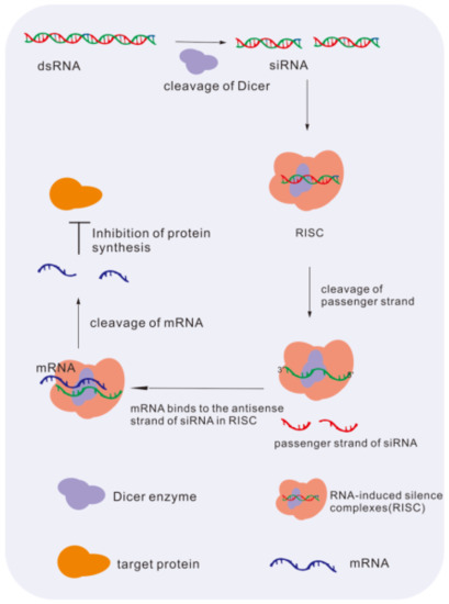 The mechanism of siRNA downregulates levels of gene. dsRNA is cleaved by the dicer enzyme to siRNA. siRNA merges into the RISC complex and binds to target mRNA for degradation. At last, the synthesis of protein is inhibited [98].
