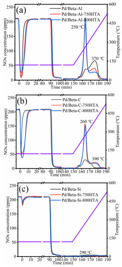 The NOx adsorption and storage capacity of (a) Pd/Beta-Al, Pd/Beta-Al-750HTA and Pd/Beta-Al-800HTA; (b) Pd/Beta-C, Pd/Beta-C-750HTA and Pd/Beta-C-800HTA; (c) Pd/Beta-Si, Pd/Beta-Si-750HTA and Pd/Beta-Si-800HTA. Feed: 200 ppm NO; 200 ppm CO, 5%H2O, 10%O2 and N2 balance.