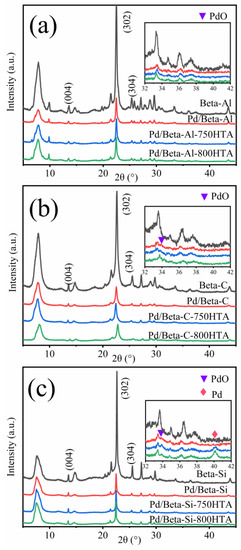 XRD patterns of (a) Beta-Al, Pd/Beta-Al, Pd/Beta-Al-750HTA and Pd/Beta-Al-800HTA; (b) Beta-C, Pd/Beta-C, Pd/Beta-C-750HTA and Pd/Beta-C-800HTA; and (c) Beta-Si, Pd/Beta-Si, Pd/Beta-Si-750HTA and Pd/Beta-Si-800HTA.