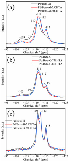 29Si NMR spectra for the (a) Pd/Beta-Al, Pd/Beta-Al-750HTA and Pd/Beta-Al-800HTA; (b) Pd/Beta-C, Pd/Beta-C-750HTA and Pd/Beta-C-800HTA; and (c) Pd/Beta-Si, Pd/Beta-Si-750HTA and Pd/Beta-Si-800HTA.