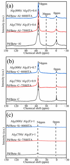 27Al NMR spectra for the (a) Pd/Beta-Al, Pd/Beta-Al-750HTA and Pd/Beta-Al-800HTA; (b) Pd/Beta-C, Pd/Beta-C-750HTA and Pd/Beta-C-800HTA; (c) Pd/Beta-Si, Pd/Beta-Si-750HTA and Pd/Beta-Si-800HTA.