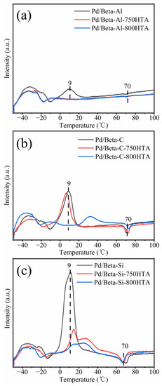 Furthermore, the Pd species on Pd/Beta zeolites with different Si/Al ratios were identified by H2-TPR measurement (Figure 6). In the temperature range of 0–50 °C, a H2 consumption peak appeared, which was attributed to the reduction of PdO species [15,40,41]. A negative peak at about 70 °C was attributed to decomposition of Pd hydride species [31,42]. For the fresh Pd/Beta-Al, the peak of PdO at 9 °C was observed and disappeared after the hydrothermal aging treatment, which again indicated that PdO was highly dispersed after the hydrothermal aging treatment. For the Pd/Beta-C zeolite, the peak at 9 °C was stronger than that of Pd/Beta-Al, suggesting the presence of more PdO species. Hydrothermal aging treatment at 750 °C also decreased the amounts of PdO species, which was similar to Pd/Beta-Al zeolites. Moreover, after the hydrothermal aging treatment at 800 °C, the temperature of PdO reduction shifted to higher temperature, also indicating the redispersion of Pd species as well as increased stability of PdO species. For the fresh Pd/Beta-Si zeolites, on the other hand, a large amount of PdO species were observed. After hydrothermal aging treatments at 750 °C and 800 °C, although the peak representing PdO species also decreased, this rarely meant high dispersion of Pd species due to the observation of a large-size particle in Figure 5i. Instead, the PdO species were reduced during hydrothermal aging due to the weak nature of ion exchange sites, and some Pd0 species were formed as indicated by the observation of a Pd0 diffraction peak in Figure 2c.