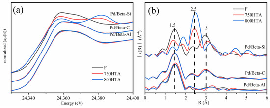 The effect of the Si/Al ratio on the local structure and state of Pd species for Pd/Beta zeolites was further investigated by X-ray adsorption fine structure (XAFS) (Figure 7). Pd K-edge X-ray absorption near-edge spectra (XANES) and extended X-ray absorption fine structure (EXAFS) spectra of PdO and Pd foil are listed in Figure S3. For XANES, the profiles were almost coincident before and after hydrothermal aging for the Pd/Beta-Al and Pd/Beta-C zeolites and resembled the profiles of reference PdO, indicating that Pd species existed in the form of PdO clusters or Pd2+ [9]. The results of EXAFS (Figure 7b) further indicated that the primary Pd species were the Pd2+ species coordinated with the zeolite framework for Pd/Beta-Al zeolites due to the absence of second scattering peak of Pd-Pd at ~3.0 Å [29,43]. However, for the Pd/Beta-C, PdO species existed as seen by the appearance of the second scattering peak at ~3.0 Å. The XANES and EXAFS profiles of Pd/Beta-Si zeolite were strikingly distinctive from the other two zeolites. With progressively hydrothermal aging, the XANES profile was closer to that of metallic Pd reference. The dramatical increase of the peak at ~2.5 Å (metal Pd-Pd) and decrease of the peak at ~1.5 Å (Pd-O) in EXAFS profiles also indicated the transformation from PdO into metallic Pd species during hydrothermal aging for Pd/Beta-Si [44,45,46].