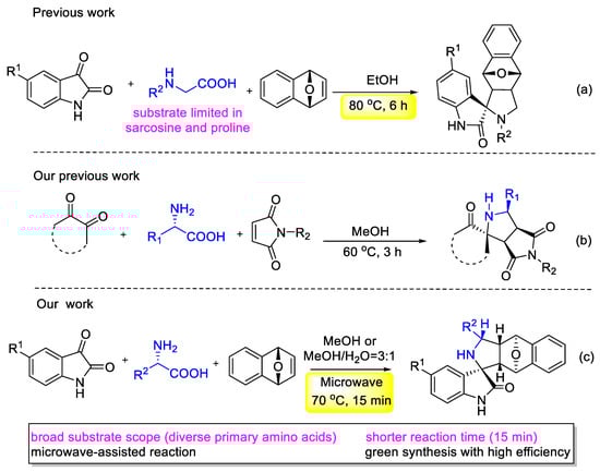 (a) Previous work of 1,3-dipolar cycloaddition of isatins, α-amino acids and oxabicyclic alkenes, (b) Our previous work of 1,3-dipolar cycloaddition, and (c) Microwave-promoted multicomponent reaction with diverse primary amino acids as reaction partner (This Work).