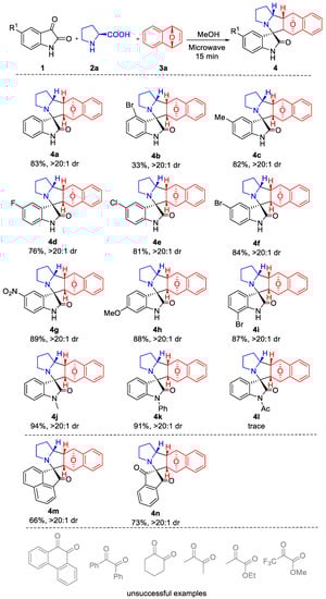 With the optimal conditions in hand, we explored the substrates’ scope of isatins, and the results were summarized in Scheme 2. Generally, isatins with various substitutions were suitable to the reaction condition. When 4-bromoisatin was subjected to the 1,3-dipole cycloaddition, product 4b was obtained in 33% yield. We speculated that the lower reaction activity was attributed to a large steric hindrance group nearby the reactive center. Isatins equipped with electron-donating (methyl) or electron-withdrawing group (fluoro, chloride, bromide, nitro) at the C5 position of the benzene ring were well-tolerated for the cycloaddition, affording the desired adducts in good to excellent yields (4c–4g, 72–89% yields). Meanwhile, 6-methoxy-isatin participated in the three-component reaction smoothly, and 4h was separated in 88% yield. When the substitution of bromide was far away from the active center, there was no obvious influence on the reaction result (87% yield of 4i). Next, isatins with the N-protection group were explored, and the outcome showed that alkyl and phenyl groups were friendly to this reaction, giving 4j and 4k in 94% and 91% yields, respectively. However, N-acetyl protected isatin furnished only trace products. Furthermore, other diketones and their analogs such as acenaphthequinone and ninhydrin were also found to be effective, as demonstrated in the successful installation of 4m and 4n. However, other diketones including 9,10-phenanthrenequinone, 1,2-diphenyl ethanedione, cyclohexanedione, acetylacetone, ethyl pyruvate and ethyl 3,3,3- trifluoropyruvate failed to undergo this reaction under standard conditions.