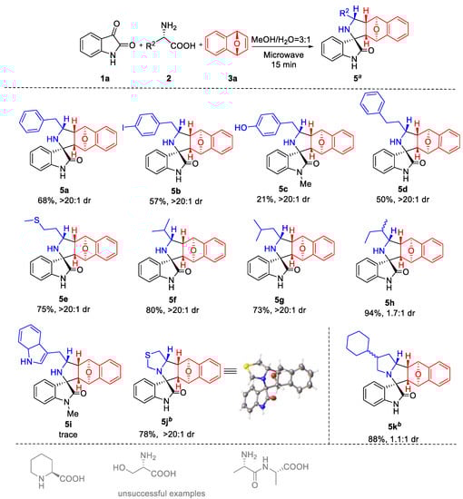 Next, to examine the feasibility of this reaction, we examined the variation of the amino acid component toward the formation of oxygen-bridged spirooxindoles (Scheme 3). Initially, the natural L-alanine was found to be unfruitful for the optimal condition, and no desired product could be isolated from the reaction mixture. We speculated that the side reactions of azomethine ylides from isatin and L-alanine are largely preferred over [3+2] cycloadditions with a dipolarophile, which makes this reaction particularly challenging. Gratefully, we found that the L-phenylalanine proceeded smoothly in methanol−water medium (MeOH:H2O = 3:1), but changing the solvent still had no positive effect on alanine. Under similar conditions, the present cycloaddition reaction was also successfully extended to other primary α-amino acids with side chains, thus greatly expanding the types of spirooxindoles accessible using this method. 4-Iodo-L-phenylalanine and L-tyrosine led to the 5b and 5c in 57% and 21% yields, respectively. It is worth noting that N-methyl protection is necessary for 5c, otherwise, no expected product was observed in the reaction system. As a common intermediate in about 20 new antihypertensive drugs in the world, L-homophenylalanine showed quite promising reactivities, leading to the desired product 5d in moderate yield. The three-component reaction of isatin with L-methionine, L-lysine and L-leucine with 3a resulted in the expected products in 73–80% yields as single isomers. It was found that the L-isoleucine afforded the spirooxindoles 5h as chromatographically separable diastereomers (1.7:1 dr). The use of tryptophan as a reaction partner proved to have low efficiency, delivering the corresponding product 5i in only trace yield. It was hypothesized that in the presence of unprotected amino acid residues, the side reactions were preferred over the expected cyclization reaction. Next, L-thiproline was tested, and 5j was obtained with a 78% yield. The structure and relative stereochemistry of 5j was unambiguously established by Single-crystal X-ray analysis (CCDC: 2243483). When trans-4-cyclohexyl-L-proline was selected for the cycloaddition, the two diastereomers of 5k were isolated in almost the same yield (46% vs. 42%). In contrast, the utilization of L-piperidine-2-carboxylic acid, L-serine and peptide L-Ala-L-Ala-OH proved unsuccessful for the reaction conditions.