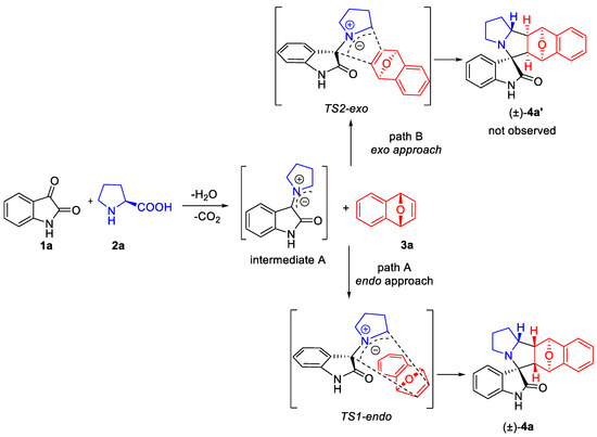 Based on the experimental results and the reported literature [45], possible mechanisms for cycloaddition were proposed as shown in Scheme 4. First, the condensation of isatin 1a with proline 2a, followed by decarboxylation furnishes ylide intermediate A, which reacts as a 1,3-dipole with 3a through two possible pathways A and B. Path A leads to the formation of the thermodynamically more stable endo-cycloadduct 4a, whereas affording the exo-cycloadduct 4a’ through path B is probably disfavored.