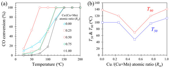 (a) CO conversion on each catalyst as a function of reaction temperature. (b) T50 and T90 as a function of Cu/(Cu + Mn) atomic ratio (Rm).
