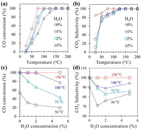 Figure 2a–c show the effect of H2O (1%, 2%, or 5%) on CO oxidation on 0.5Cu–Mn2O4. CO conversion and CO2 selectivity decreased when increasing H2O concentration, indicating that H2O can influence CO oxidation. H2O (up to 5%) influence on CO conversion and CO2 selectivity can be eliminated at 150 °C (Figure 2d) and implies that the 0.5Cu–Mn2O4 catalyst has good water resistance performance above 150 °C.