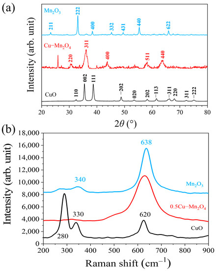 XRD patterns (a) and Raman spectra (b) of Mn2O3, 0.5Cu–Mn2O4, and CuO.