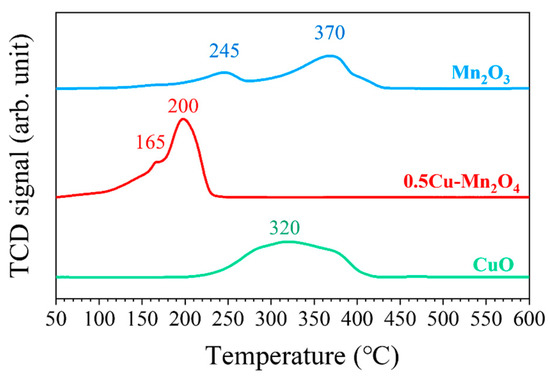 Figure 7 shows the H2-TPR profiles of each catalyst. CuO had a wide peak at 320 °C, and Mn2O3 had two peaks at 245 and 370 °C. The catalyst 0.5Cu–Mn2O4 had two peaks at 165 and 200 °C. After Cu doping, the reduction peak shifted towards low temperature, indicating that a strong synergy between Mn and Cu contributed reactive oxygen species in the lattice and on the surface that could react with H2 at lower temperature.