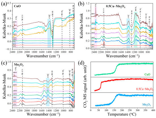 Operando DRIFTS spectra during CO oxidation between 25 and 400 °C on CuO (a), 0.5Cu–Mn2O4 (b), and Mn2O3 (c). (d) CO2 MS signals at various temperatures.