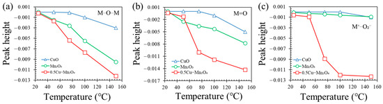 Changes of peak heights of (a) M-O-M, (b) M=O, and (c) M- on each catalyst as functions of temperature.