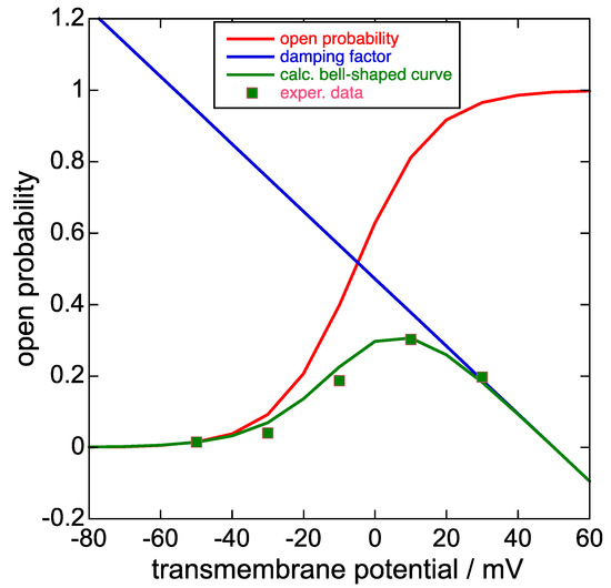 Plot of the steady-state activation curve, i.e., the open probability (red curve), the damping factor (blue straight line), the product of the two at each transmembrane potential (green curve), and the experimental points of the bell-shaped curve in Figure 1c of [8] upon ascribing a 0.30 value to its highest point on the vertical scale normalized to unity. Unfortunately, Piper et al. [8] did not show this bell-shaped curve together with the corresponding steady-state activation curve on the same vertical scale, unlike [1] and [24]. The damping factor does not strictly refer to the open probability scale, although it takes values between about 0 and 0.8 on this scale for transmembrane potential values ϕ varying from +40 to −40 mV.