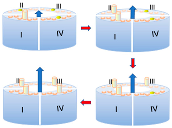 Schematic of the arrangement of the four subunits (I)–(IV) of a Shaker or hERG potassium channel around the central pore during the stepwise opening of the channel. The six disks on top of each of the four subunits denote the six α-helices, with the S4 helices in yellow and the other five helices in light brown. More precisely, during the first opening step of the channel, the S4 helix of subunit I moves outward and is represented as a yellow cylinder, while the three other S4 helices are still in the ‘in’ position. Following the direction of the red arrows, all four S4 α-helices move outwards step by step, and the K+ outward current, represented as a progressively longer outward blue arrow, increases accordingly.
