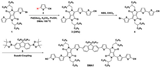 In 2016, Chen et al. reported the synthesis of acceptors SMA1 by the direct arylation coupling reaction [33]. As shown in Figure 1, the electron-withdrawing group thiophene-2-carbonitrile (2) was connected to mono-brominated thiophene-diketopyrrolopyrrole (DPP) 1 through direct arylation coupling reaction under the catalyst of palladium(II) acetate (Pd(OAc)2). However, because of the competition of the self-coupling reaction of 1, compound 3 was obtained at a low yield of 24%. After bromination, the intermediate compound 4 further reacted with fluorene diboronic ester (5) through Suzuki coupling to afford the final acceptor SMA1 in 70% yield. SMA1 molecules exhibit a high electron mobility of up to 10−3 cm2 V−1 s−1 in bulk heterojunction blends. OSCs employing SMA1 as an acceptor and poly (3-hexylthiophene) (P3HT) as a donor showed a PCE of 2.37% with an open circuit voltage (Voc) of 0.97 V, a short circuit current density (Jsc) of 6.25 mA cm−2, and a fill factor (FF) of 0.39.