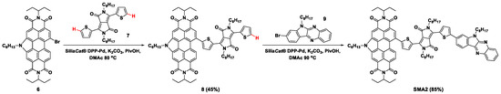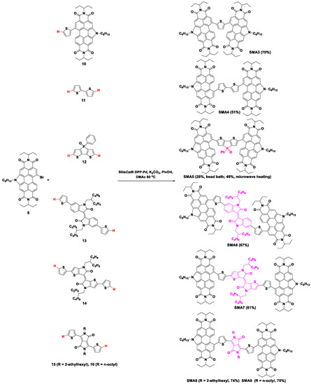 In 2017, an unsymmetrical acceptor SMA2, consisting of N-annulated perylene diimide (PDI) (6), thienyl DPP (7), and indoloquinoxaline (9) units to enable panchromatic absorption, was synthesized by two-step direct arylation coupling reactions (Figure 2) [34]. In the beginning, 6 reacted with 7 catalyzed with the heterogeneous palladium catalyst SiliaCat® DPP-Pd, to obtain the mono-substituted product 8 in 45% yield. Moreover, the following direct arylation coupling reaction was performed between 8 and 9 in the same condition but higher reaction temperature of 90 °C to form the acceptor SMA2 with a satisfactory yield (85%). However, OSCs taking SMA2 as the acceptor and P3HT as the donor showed a relatively low PCE of 0.81%. Then, a series of symmetrical acceptors SMA3–SMA9 flanked by N-annulated PDI were further prepared [35,36,37,38,39]. Chemical structures and synthetic routes of the acceptors SMA3–SMA9 are shown in Figure 3. PDI monobromide 6 could react with the unactivated thiophene-containing counterparts in the presence of SiliaCat® DPP-Pd, potassium carbonate (K2CO3), and pivalic acid (PivOH) in N,N-dimethylacetamide (DMAc) to obtain the target products SMA3–SMA9 in moderate yields (51–74%).