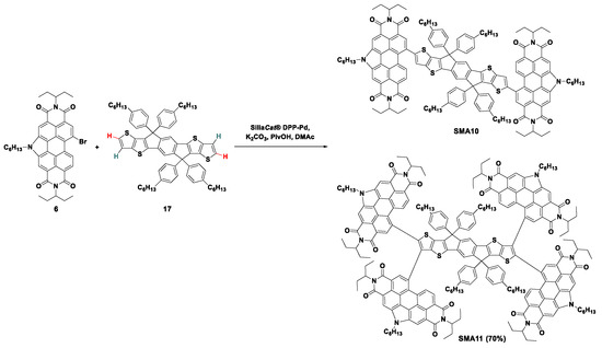 In 2018, the SiliaCats® DPP-Pd catalyzed direct arylation reaction was extended to synthesize an indacenodithieno[3,2-b]thiophene (IDTT) linked N-annulated PDI acceptor [40]. Surprisingly, instead of the bis-substituted product SMA10, the SiliaCats® DPP-Pd catalyzed reaction proceeded largely to the tetra-substituted product SMA11 as shown in Figure 4. This result provided a new way to access the quadruple PDI compound. By increasing the feed ratio of 6 and 17 to 4.2 and the reaction temperature to 120 °C, SMA11 was obtained as a fine dark red crystalline powder in 70% yield. As expected, with four PDI units, SMA11 displayed a high molar absorption coefficient exceeding 200,000 M−1 cm−1, approximately four times that of monomeric PDI species. OSCs taking the polymer PTB7-Th as a donor and SMA11 as an acceptor were fabricated to study the photovoltaic performances. The inverted bulk-heterojunction (BHJ) OSCs based on PTB7-Th:SMA11 showed a good photovoltaic response with PCEs of 3.4% and a high Voc of up to 1.0 V. The hole and electron mobilities of the PTB7-Th:SMA11-based active layer were 2.74 × 10−4 cm2 V−1 s−1 and 4.00 × 10−6 cm2 V−1 s−1, respectively, through space charge-limited current (SCLC) measurement. The active layer’s low electron mobility and unbalanced charge transport should be one of the most important reasons for the low Jsc (8~10 mA cm−2) and FF (0.34~0.35). All in all, this study provided a new way for the synthesis and further development of tetra-substituted IDTT derivatives by C-H direct arylation.