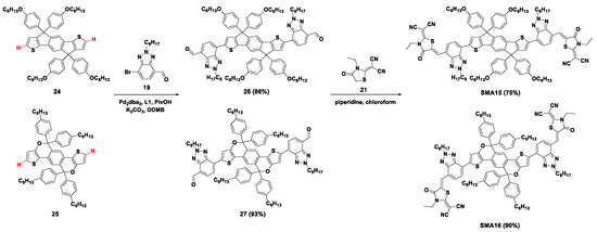 Later, this protocol was further applied to prepare the similar A-D-A type acceptors SMA15 and SMA16 with various electron-donating cores, as shown in Figure 6. Through the direct arylation coupling reaction between IDT derivative 24 or its analog 25 and 19, the intermediates 26 and 27 were obtained in high yields of 86% and 93%, respectively. The dialdehydes were subsequently reacted with dicyanomethylene-3-ethylrhodanine (21) in the presence of piperidine to produce SMA15 and SMA16. This type of SMA proved to be a promising candidate for P3HT-based OSCs. Solar cells taking P3HT:SMA15 and P3HT:SMA16 as active layers exhibited relatively high PCE of 6.56% and 6.31% [45].