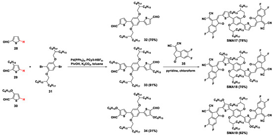 By direct arylation coupling and Knoevenagel condensation, non-fused ring electron acceptors SMA17–SMA19 were readily prepared (Figure 7) [46]. The thiophene-2-carbaldehydes (28–30) reacted with 1,4-dibromo-2,5-bis((2-hexyldecyl)oxy) benzene (31) with the catalyst of tetrakis(triphenylphosphine)palladium(0) (Pd(PPh3)4)/tricyclohexylphosphonium tetrafluoroborate (PCy3·HBF4) to produce the dialdehyde intermediates 32–34 in yields of 70%, 61%, and 31%. Then, the target products were accessed from the condensation reaction of the dialdehydes and 5,6-difluoro-1,1-dicyanomethylene-3-indanone (35). Employing PBDB-TF (PM6) as an electron donor, the PCE of OSCs taking SMA17, SMA18, and SMA19 as the acceptors were 4.08%, 10.27%, and 6.62%, respectively.