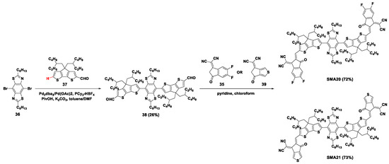 In the same year, electron-withdrawing building blocks benzobis(thiazole) with quinoid-resonance effect were employed as the core to construct non-fused acceptors SMA20 and SMA21, as shown in Figure 8 [47]. The benzobis(thiazole) dibromide (36) was coupled with 4H-cyclopenta[2,1-b:3,4-b′]dithiophene (CPDT) carboxaldehyde (37) in a complicated direct arylation reaction condition containing double catalysts (Pd2dba3 and Pd(OAc)2) and double solvents (N,N-dimethylformamide (DMF) and toluene) in the presence of PCy3·HBF4 ligand, K2CO3 base, and PivOH additive. However, this condition only gave the trimer intermediate 38 with a low yield of 26%. The dialdehyde intermediate was treated with 35 or 2-(6-oxo-5,6-dihydro-4H-cyclopenta[c]thiophen-4-ylidene)malononitrile (39) with the catalyst of pyridine to afford the target acceptors SMA20 and SMA21, in yields of 72% and 73%, respectively. Using PBDB-T as the electron donor, SMA20 and SMA21-based OSCs exhibited high PCE of 11.50% and 10.17% with high Jsc of 21.80 mA cm−2 and 17.97 mA cm−2, respectively.